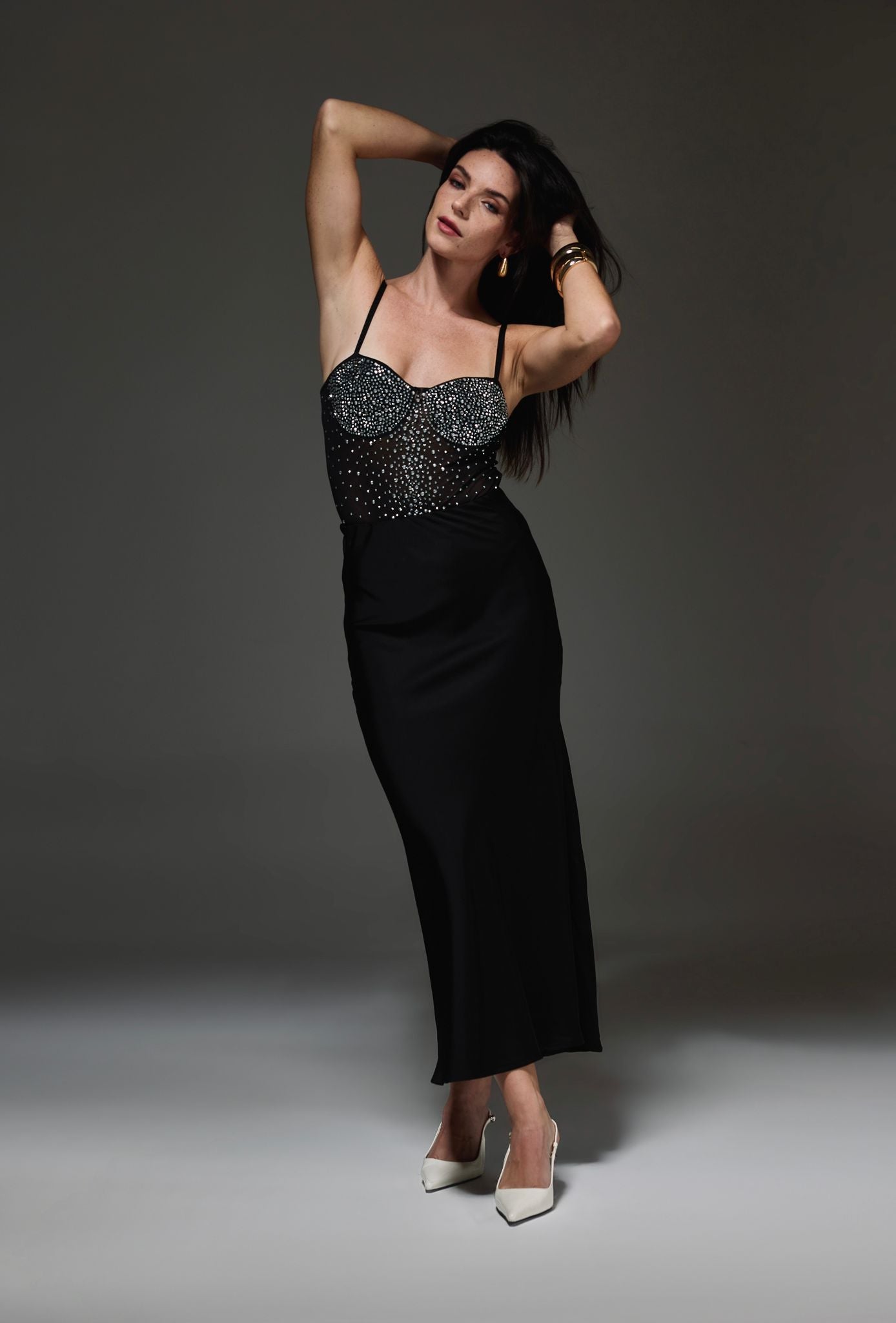 Body negro de tirante con piedras en el pecho ideal para combinarlo con faldas largas o de tul. Hecho con las mejores materiales y con un corte perfecto para sacar la musa que cada invitada lleva dentro. La disponibilidad de las tallas se acabará de confirmar una vez pasado el pedido a tienda, vía Whatsapp o a través del pedido directo en la página web.