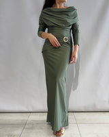 Vestido largo escote casacda deal para bodas, eventos, cocktails y todo tipo de celebraciones. La disponibilidad de las tallas y colores se acabará de confirmar una vez pasado el pedido a tienda, vía Whatsapp o a través del pedido directo en la página web.