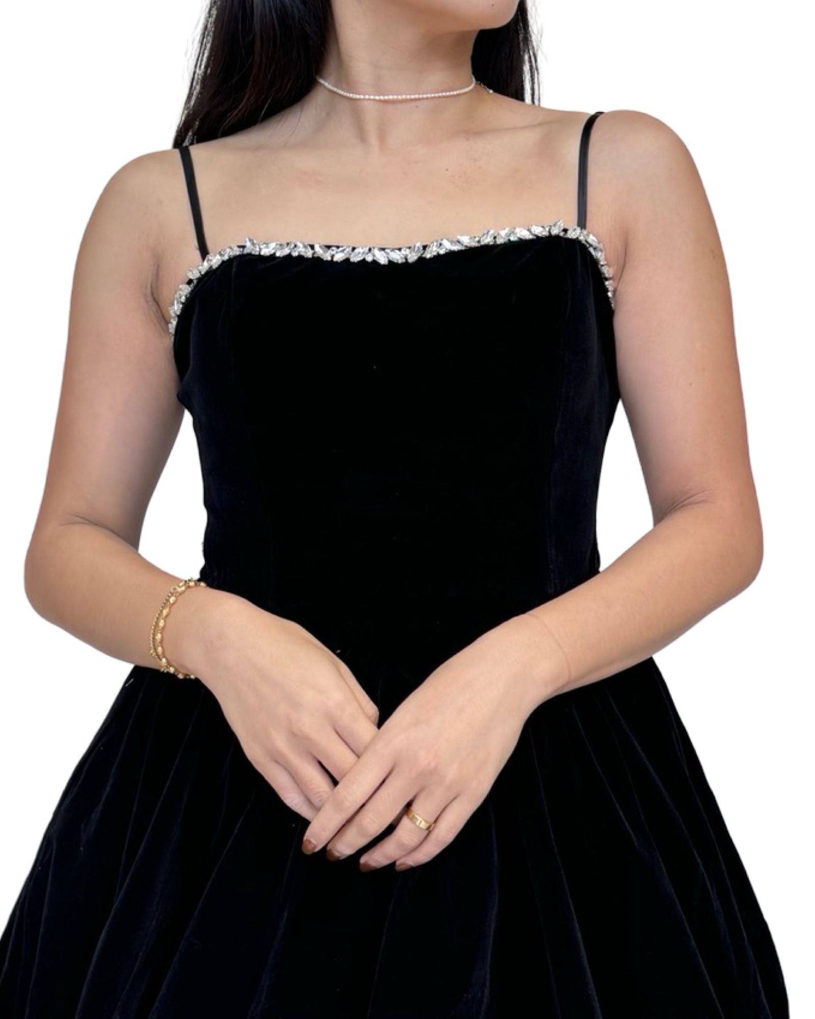 Vestido corto de terciopelo,ideal para bodas, eventos, cocktails y todo tipo de celebraciones. Lentejuelas y espalda descubierta. La disponibilidad de las tallas y colores se acabará de confirmar una vez pasado el pedido a tienda, vía Whatsapp o a través del pedido directo en la página web.