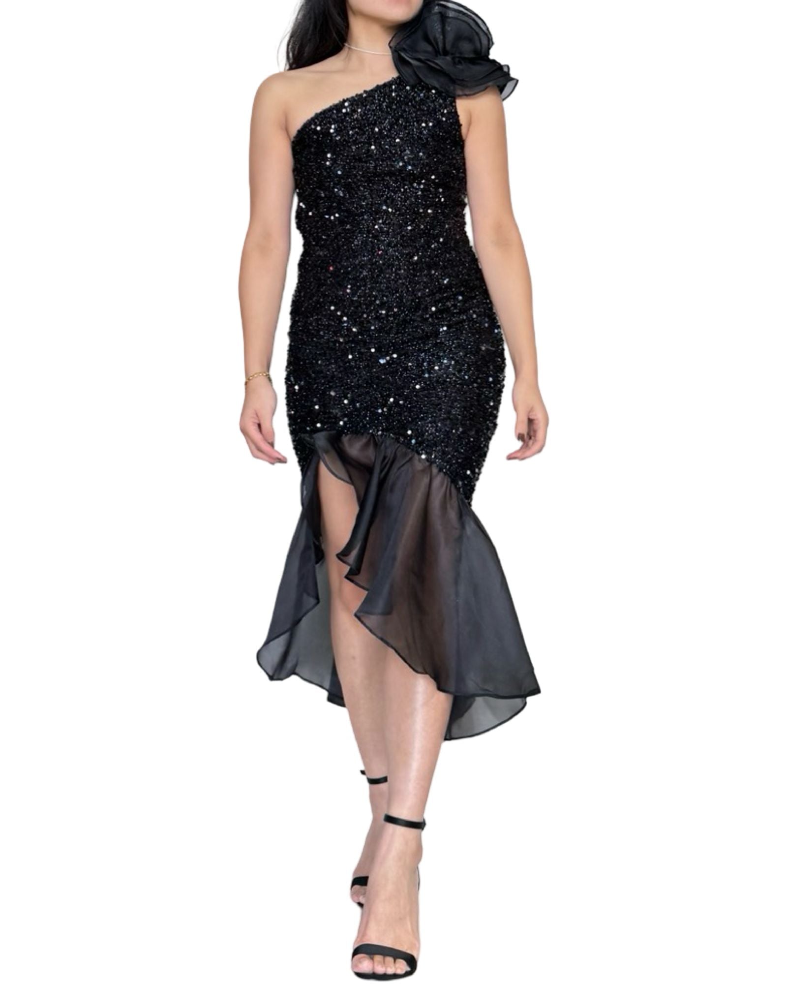 Vestido corto de lentejuela, con tul en a parte inferior y flor en el tirante, ideal para bodas, eventos, cocktails y todo tipo de celebraciones. La disponibilidad de las tallas y colores se acabará de confirmar una vez pasado el pedido a tienda, vía Whatsapp o a través del pedido directo en la página web.