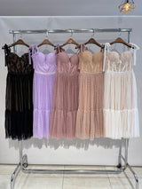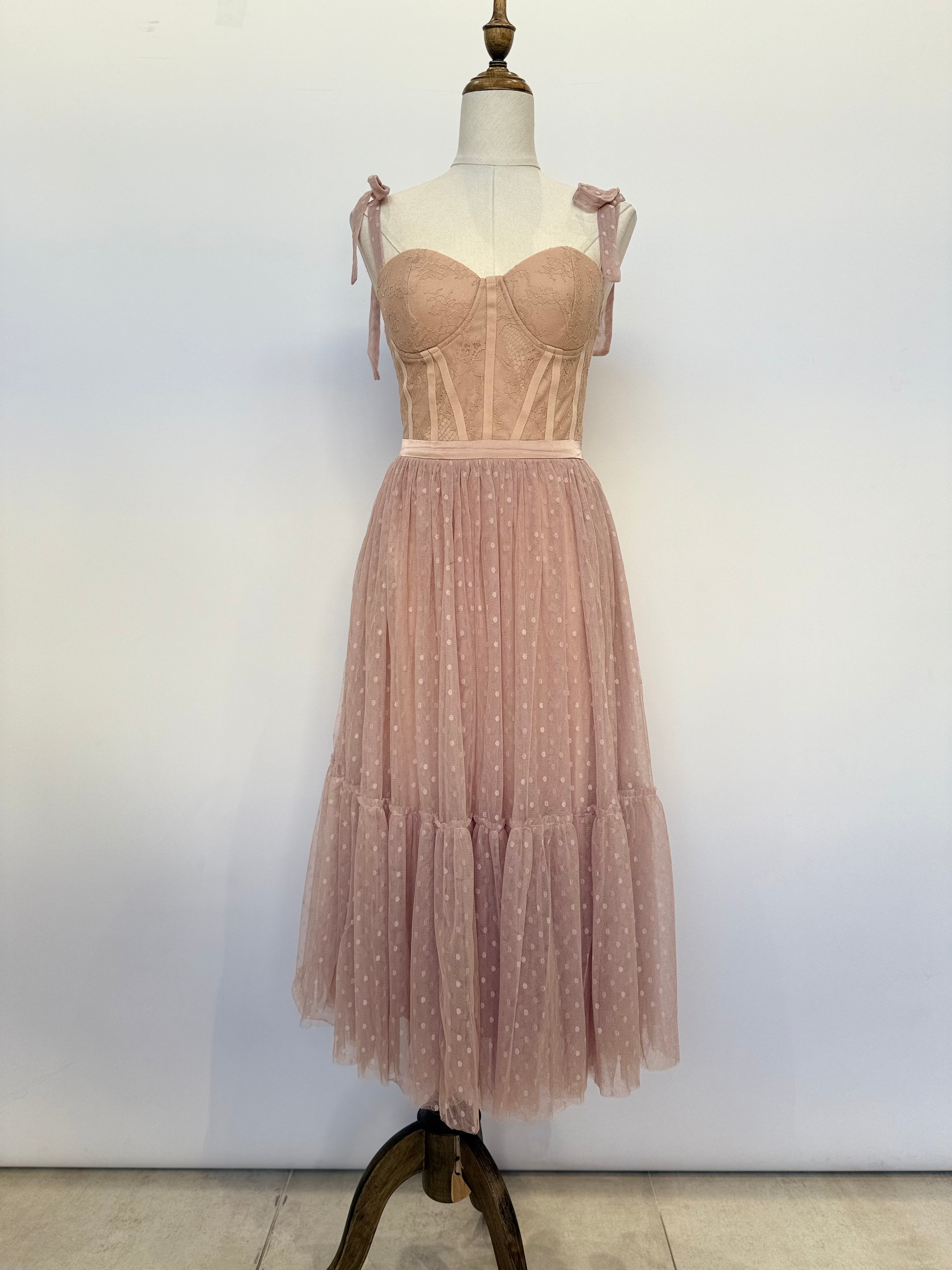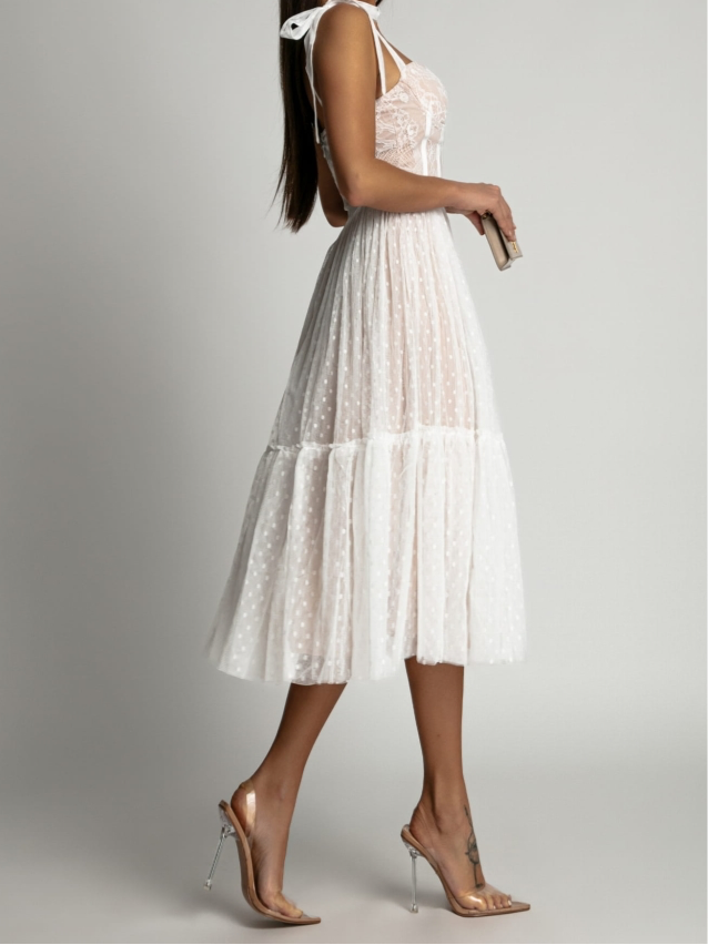 Vestido midi de tul con encaje en el pecho, ideal para bodas, eventos, cocktails y todo tipo de celebraciones. Hecho con las mejores materiales y con un corte perfecto para sacar la musa que cada invitada lleva dentro. La disponibilidad de las tallas y colores se acabará de confirmar una vez pasado el pedido a tienda, vía Whatsapp o a través del pedido directo en la página web